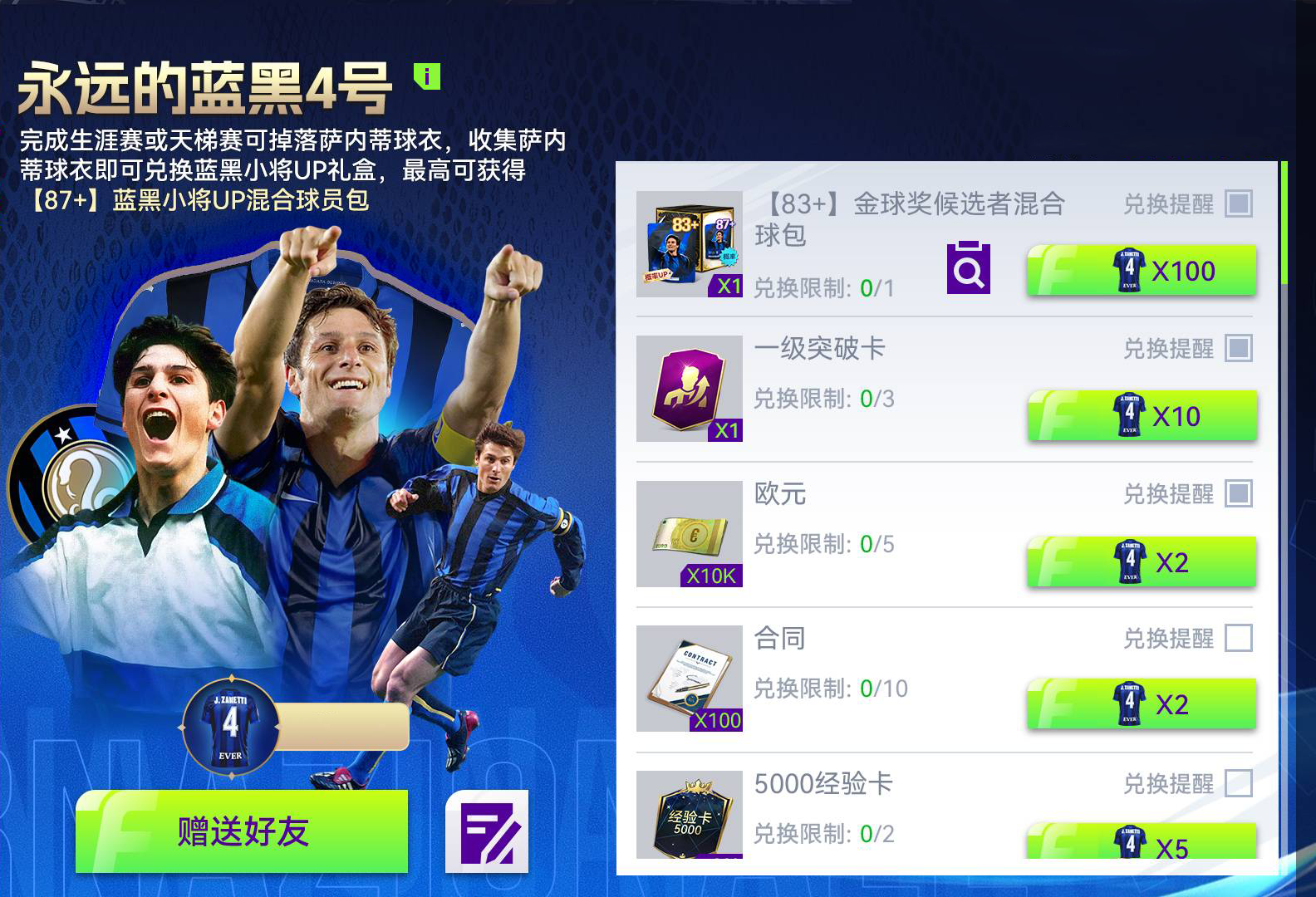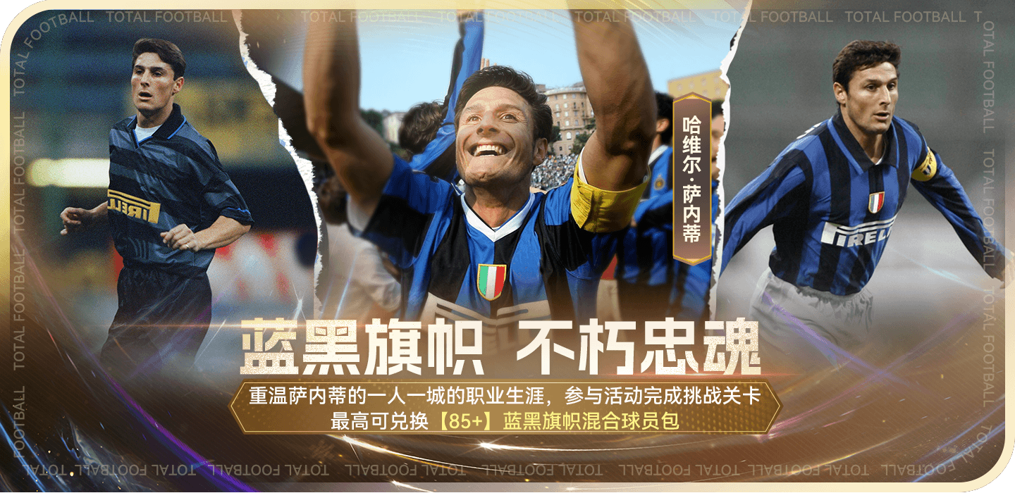 回顾萨内蒂一人一城的职业生涯,参与活动,完成挑战关卡最高可兑换【85+】蓝黑小将主题球员包,有概率获取大使主题-萨内蒂。这是献给“蓝黑旗帜”的纪念章节,从青涩少年到队长,从“4号”球员到球迷心中的忠魂图腾!现在参与活动,你就有机会将这位永恒的蓝黑战士迎入你的球队。