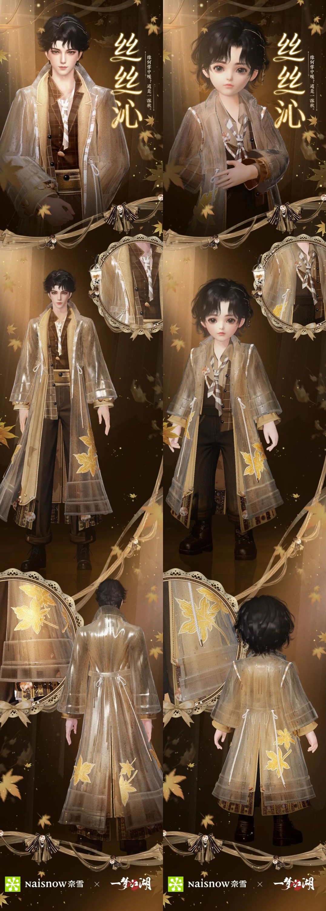 整体衣饰似将秋日枫林与手中暖饮糅合一处,甜而不腻,暖而不灼。愿少侠身着时装·丝丝沁,行过落叶沙沙的小径时,总有一杯温柔在手,融却半季凉意,独留唇齿间回甘的时光。