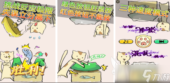 开局后屏幕会被一分为二,这款游戏其实比较考验的就是彼此之间的反应能力,因为其中的猫咪颜色完全不同,而大家也需要按钮颜色的变化一决胜负。比如在屏幕中如果出现绿色的物品时,那么此时千万不要按下红色的按钮,否则就会导致游戏失败。每个关卡中都有规定的时间,需要在短时间之内一决胜负,还有三种不同的模式等大家随意挑战。